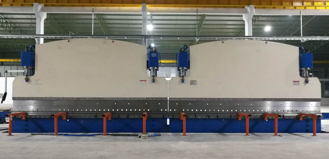 If need two units working together, only need to rotate the switch to Synchronization position on the control panel of the main unit. Both unit position signal will be sent to CNC control system (Delem system), and output signal from CNC system will sent to proportional valve and prefill valve. To control fast down, speed change point, pressing speed and return speed to keep the two unit Synchronization with high precision