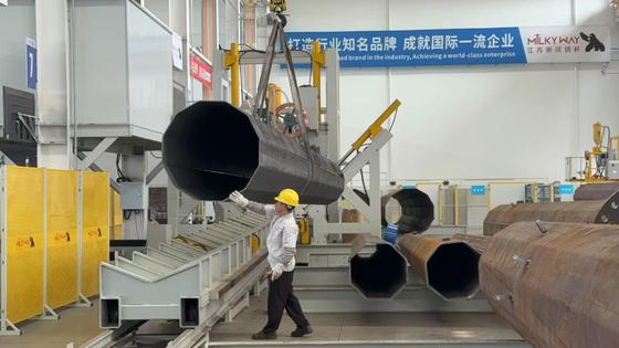 High Mast Pole Shut Welding Machine, it is suitable for one shell or two shells type polygonal and circle taper pole. it is automatic welding line, the gantry type structure is fixed and with welding system, fully pole length trolley with Servo motor for speed adjustable moving. The hydraulic cylinder can push the clamping wheel to close the pole and do shut welding at same time.