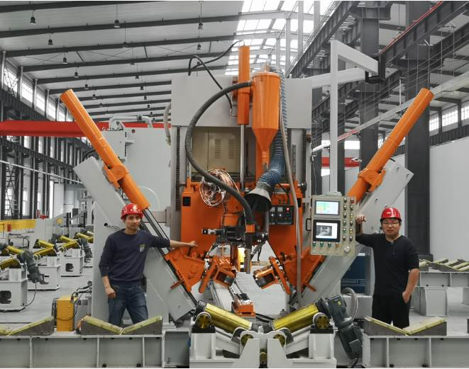 Optional:Street light pole loading and unloading system: On the left side of the machine, there is a storage rack, which can store 20~30 poles (the number varies according to the size of the poles). After the welding is completed, press the button, and the street light pole will be discharged to discharge On the storage rack which on right side of machine, it can store 20 poles (the number varies according to the size of the poles). No overhead crane is required from each pole loading to unloading.